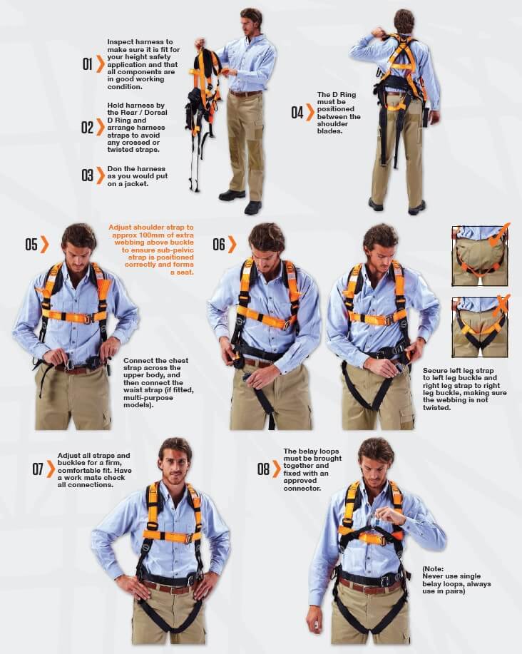 Adjust all straps and buckles for a firm, comfortable fit. Have a work mate check all connections.