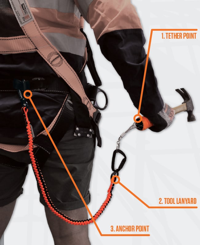 The anchor point needs to be just as robust as the rest of the system. For lighter tools, they can be secured to a wristband, a work belt or to a harness worn by the worker. Heavier items should be tethered to a strong, fixed point such as a load rated rail or beam.